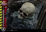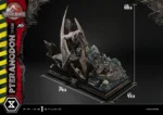 From the razor-sharp beak and prominent cranial crest to the sinewed texture of its back, every detail of the adult is rendered with striking realism. The wing membranes are brought to life through intricate sculptwork and a paint application rich in shadow and tone. The juveniles feature softer body proportions and thinner wings, with wide, expressive eyes that suggest both innocence and threat. The base, adorned with rusted steel frames, decayed nesting debris, and a scattered skull, completes the scene with a heightened sense of realism.